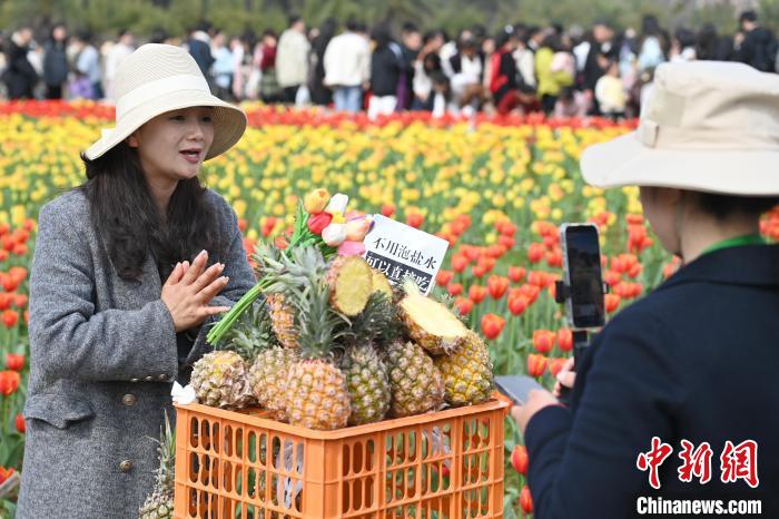 圖為商戶在花叢中進行直播帶貨賣鳳梨。中新社記者 楊華峰 攝