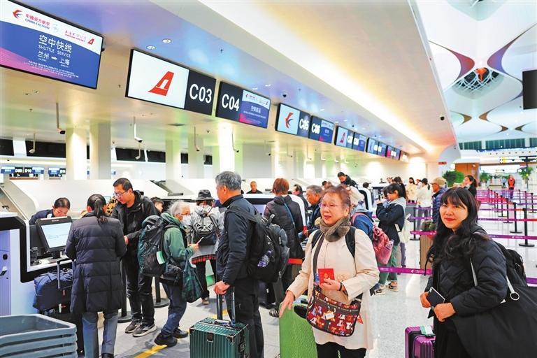 旅客在T3航站樓出港大廳柜臺窗口辦理值機(jī)。新甘肅·甘肅日報(bào)記者 田蹊