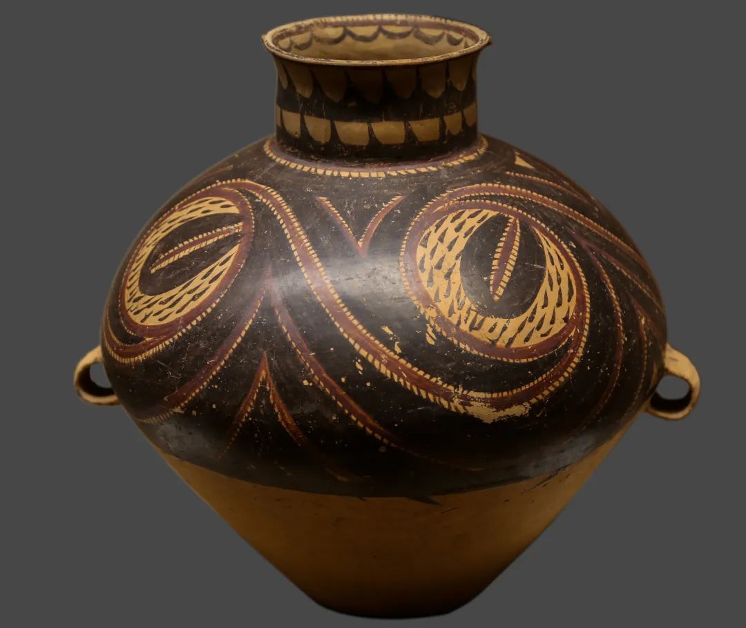旋渦紋由黑彩繪制的螺旋線條構(gòu)成,線條從中心向外延伸,形成連續(xù)旋轉(zhuǎn)的幾何圖案。多見于陶罐腹部或盆沿,線條粗細(xì)均勻,疏密排列規(guī)律,常與波浪紋組合,呈現(xiàn)動(dòng)態(tài)視覺效果。