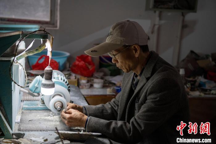 2月3日,廣西北海,林日光將貝殼打磨成所需形狀。 陳秋霞 攝