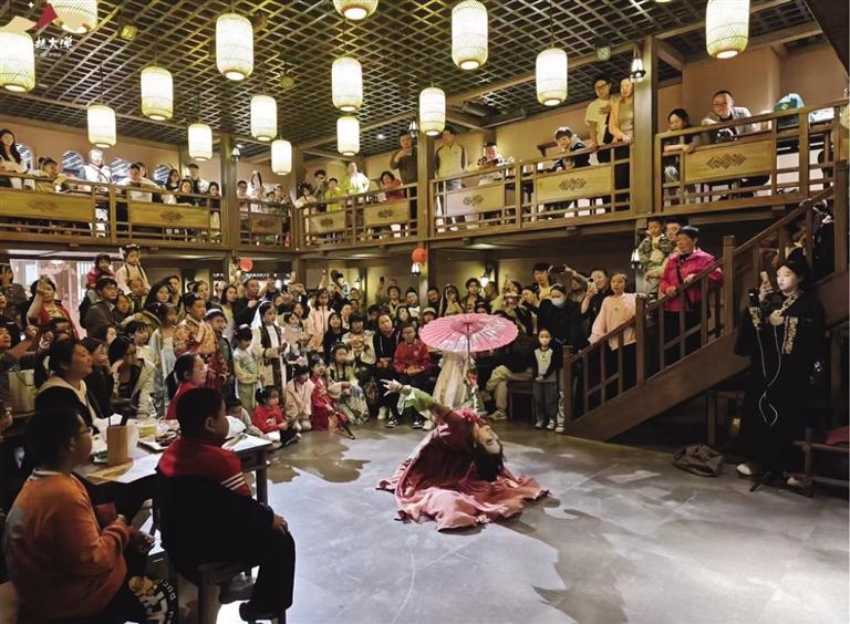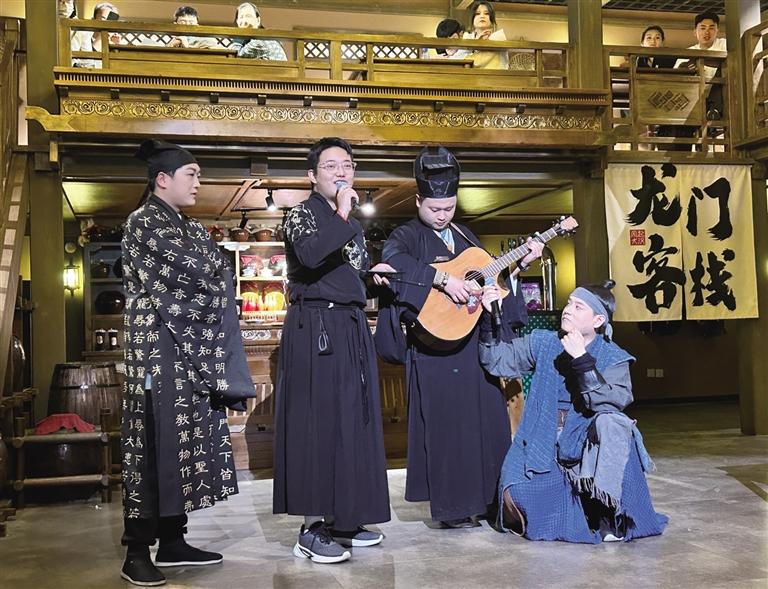 “諸位小友近來可好?”“好!”在街區(qū),NPC們與游客的互動成為一大亮點。為了讓游客更好地沉浸其中,街區(qū)里的“蘭裳閣”專門提供服裝出租和妝造設(shè)計服務(wù)。游客們在這里換上漢服、做好造型,“穿越”成古人與NPC們共同沉浸在這場歷史旅行中。張偉彥在“龍門客棧”工作快半年了,飾演店小二馬一刀。他對角色有著自己的理解:“導(dǎo)演讓我演店小二,大家印象里店小二都是機靈、腿腳快的。但我演的這個店小二帶著江湖氣息,他藏在龍門客棧,其實是個刀客,在這里打工是為了打探消息,畢竟龍門客??墒墙⒌木奂?。”記者走在街區(qū),時不時就能看到他拿著草帽,熱情地招呼游客玩接帽子游戲。遇到靦腆不敢嘗試的游客,他也會不斷鼓勵,有時候碰上外國游客,他還隨口說幾句英語與其互動。