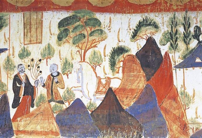 在敦煌壁畫中有關對弈的內容較多。在莫高窟第454窟、第7窟壁畫中都有“弈棋圖”。兩幅圖的畫面有不少類似的地方:一是畫師較為突出棋盤的位置,兩幅壁畫中的棋盤都居中且形制相對巨大;二是畫面上的人物均為三人,兩人對弈,一人觀戰(zhàn),“觀棋不語真君子”;三是對弈者身后的景色都是天朗氣清、遠山含黛。據說,一天,北宋大文豪蘇東坡與摯友黃庭堅正在松樹底下弈棋。一陣風吹來,松果掉進棋盤。蘇東坡隨即吟道:“松下圍棋,松子每隨棋子落。”黃庭堅馬上回答道:“柳邊垂釣,柳絲常伴釣絲懸。”雅趣十足。其實,棋局里的一動一靜、一招一式無不需要謹小慎微、穩(wěn)扎穩(wěn)打。而對弈時的當斷則斷、示假隱真、有效合作等戰(zhàn)術不僅是對弈的智慧,也是人生的哲理吧。