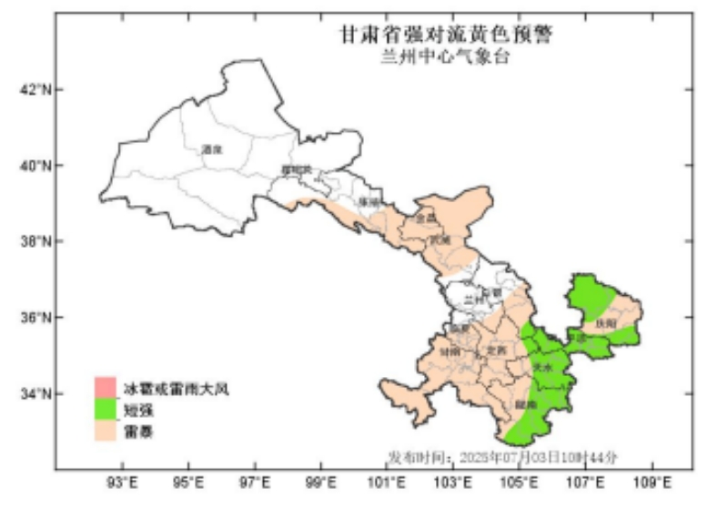 蘭州中心氣象臺2025年7月3日10時44分繼續(xù)發(fā)布強對流黃色預警:預計未來24小時,張掖、金昌、武威、蘭州、白銀、甘南、臨夏、定西、隴南、天水、平?jīng)?、慶陽等州市有雷暴,其中隴南、天水、平?jīng)?、慶陽等市部分地方及白銀、定西兩市局部地方有短時強降水,最大小時雨強20-60mm;隴南、天水、平?jīng)?、慶陽等市強降水在未來24小時內(nèi)多發(fā),白銀、定西主要強降水時段在4日2-8時。請注意防范!