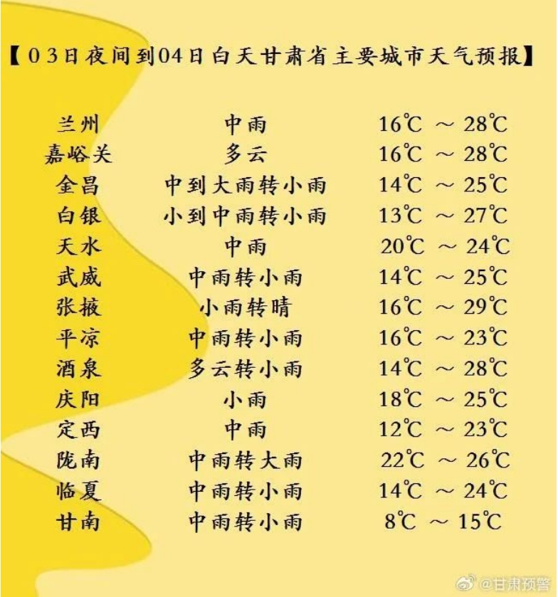 今天夜間到明天白天(7月3日20時-7月4日20時),酒泉、嘉峪關、張掖三市多云間陰,局部地方有小雨,祁連山區(qū)有中到大雨;省內(nèi)其余地方陰有小到中雨,其中隴南、天水、平?jīng)?、慶陽等市局部地方及定西、甘南兩市州東部、白銀市南部有暴雨。