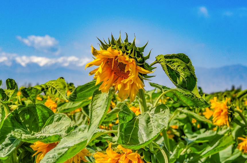 中國甘肅網(wǎng)7月14日訊 據(jù)嘉峪關日報報道(融媒體中心記者 李巍 攝)近日,嘉峪關市新城鎮(zhèn)野麻灣村“千畝”制種向日葵迎來盛花期,朵朵花盤匯聚成金色花海,放眼望去,與雪山相融、與藍天相接,如詩如畫,美不勝收。