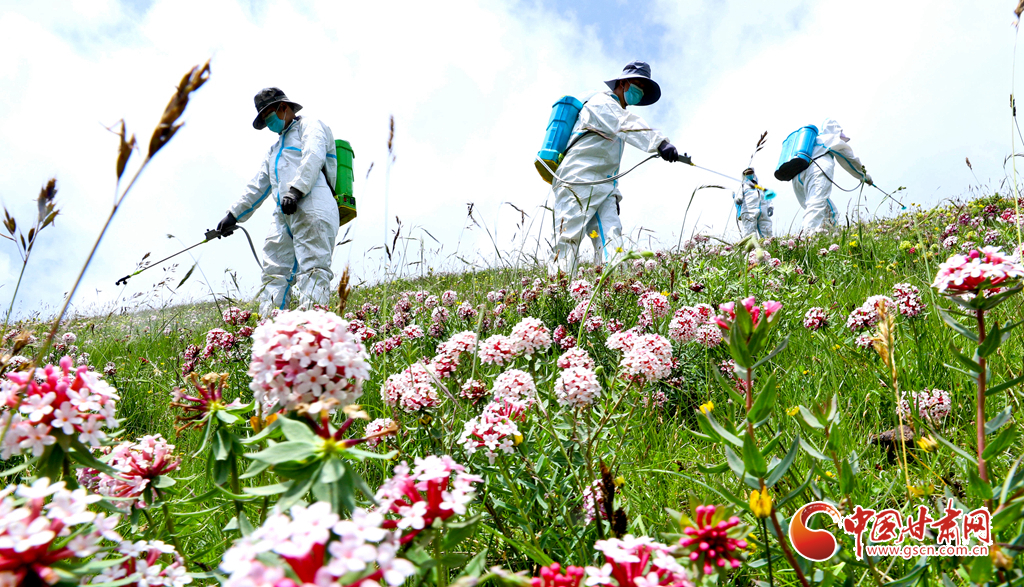 盛夏時(shí)節(jié),位于張掖市肅南裕固族自治縣的皇城夏日塔拉草原、康樂(lè)賽汗塔拉草原,宛如一塊巨大的綠色絨毯鋪向天際,滿目翠綠,令人心醉神迷。然而,此時(shí)也正是草原上狼毒花毒害草盛放、蝗蟲(chóng)繁殖的高峰期。連日來(lái),肅南縣林草專業(yè)技術(shù)人員帶領(lǐng)2000多牧民,抓住毒害草開(kāi)花、蝗蟲(chóng)繁殖最快,也是清除滅殺的最佳時(shí)機(jī),在“三北”工程六期160多萬(wàn)畝廣袤的草原上,打響了以“蟲(chóng)害防治+害草治理+噴施葉面+播撒草籽的”為核心的“三北”工程林草濕荒一體化保護(hù)修復(fù)攻堅(jiān)戰(zhàn)。