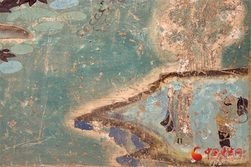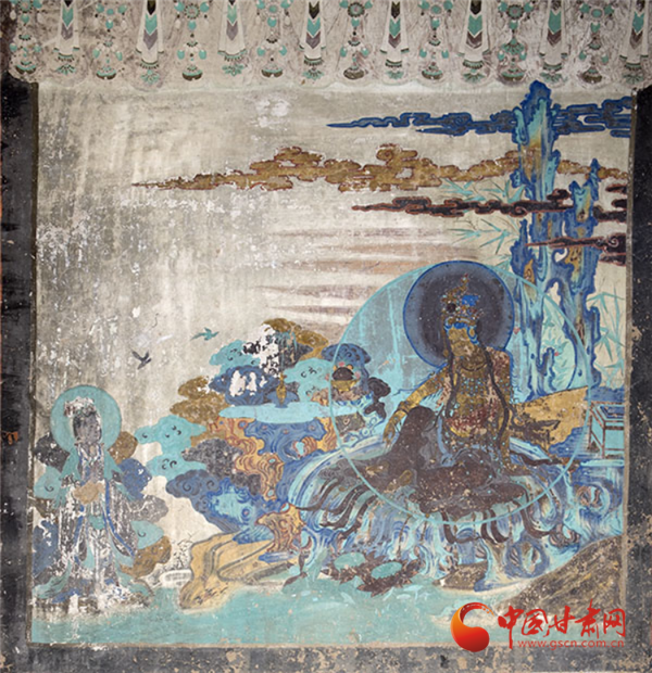 兩幅作品均以青綠色調(diào)為主,觀音面部貼金雖已氧化,卻仍顯清新淡雅,更以“馬一角、夏半邊”的構(gòu)圖巧思,用對角線分割畫面、大量留白,讓有限的壁面生出無窮空間感,堪稱中國傳統(tǒng)美學與佛教哲理的完美融合——正如唐代白居易贊水月觀音“凈淥水上,虛白光中”,這般意境在榆林窟的壁畫里被演繹得淋漓盡致。