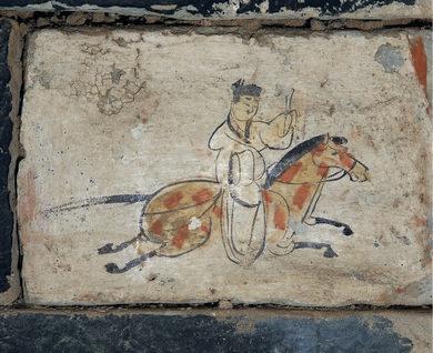 它的“不一般”,首先在于其“極簡卻傳神”的藝術(shù)風(fēng)格。該磚的畫面以赭石色為底,墨線寥寥,卻生動勾勒出一位策馬疾馳的驛使:頭戴魏晉幘帽,身著右衽短衫,左手控韁,右手舉著文書。而駿馬則四蹄騰空,動態(tài)感十足,一種風(fēng)馳電掣的緊迫感似從畫中撲面而來。更耐人尋味的是,畫師刻意省略了驛使的嘴巴:這一“殘缺”設(shè)計(jì),并非疏忽,而是古人智慧的體現(xiàn),象征著郵驛制度中“守口如瓶”的保密原則,使其成為中國古代信息保密文化的生動見證。