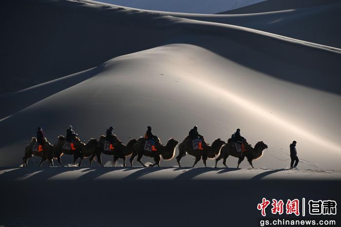 1月10日,游客在甘肅省敦煌市鳴沙山月牙泉景區(qū)游覽。