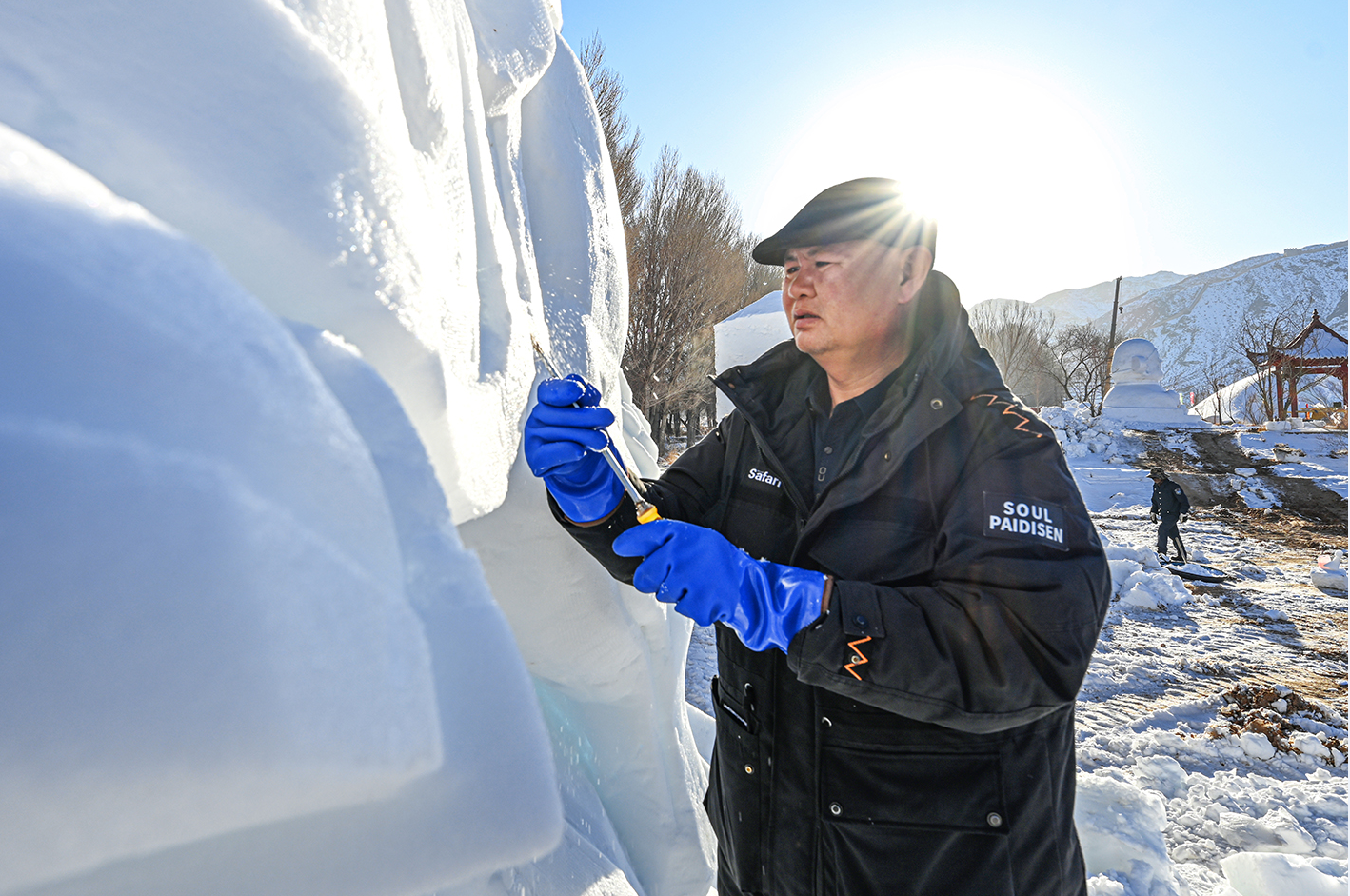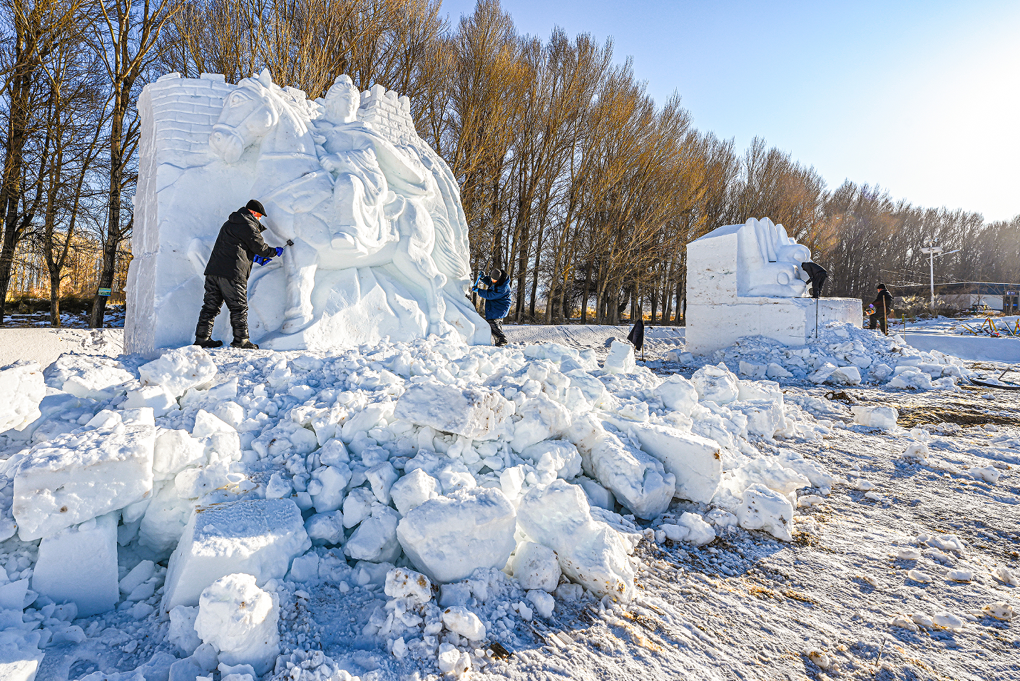 中國(guó)甘肅網(wǎng)1月13日訊 據(jù)嘉峪關(guān)日?qǐng)?bào)報(bào)道(融媒體中心記者 李巍 攝)揚(yáng)鏟塑造型,落刀雕精彩。1月10日,懸壁長(zhǎng)城腳下,《昭君出塞》《九尾靈狐》《喜財(cái)神》等雪雕作品,在匠人們的精雕細(xì)琢中漸漸揭開“面紗”。